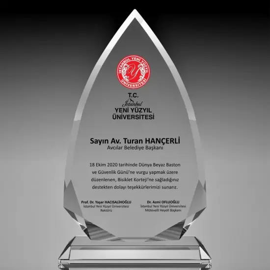Kristal Plaket, kişilerin başarılarını ödüllendirmek için verilen onur ödülüdür. Üzerine temenni yazı, logo ve isim yazıldığından dolayı manevi değeri yüksektir. Kristal Plaketler firmalara, organizasyonlara özel olarak farklı modellerde üretilmektedir Kristal Plaket MODEL 18 sivri ucu ve oval desen alt formu ile adeta bir elması anımsatıyor buda sevdiğinizin değerini daha iyi göstericek sizde sevdiklerinizi kristal plaket ile ödüllendirin sevginize değer katın.